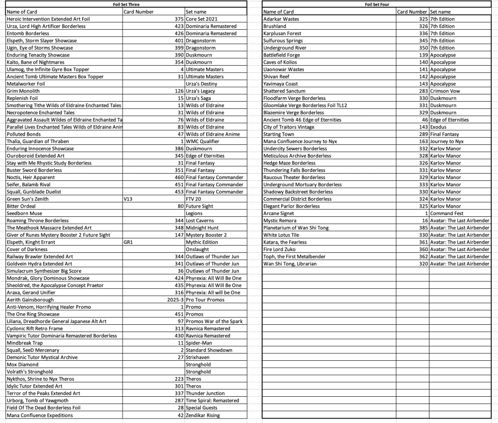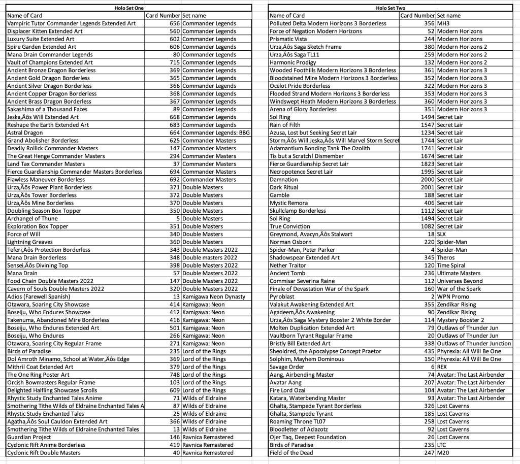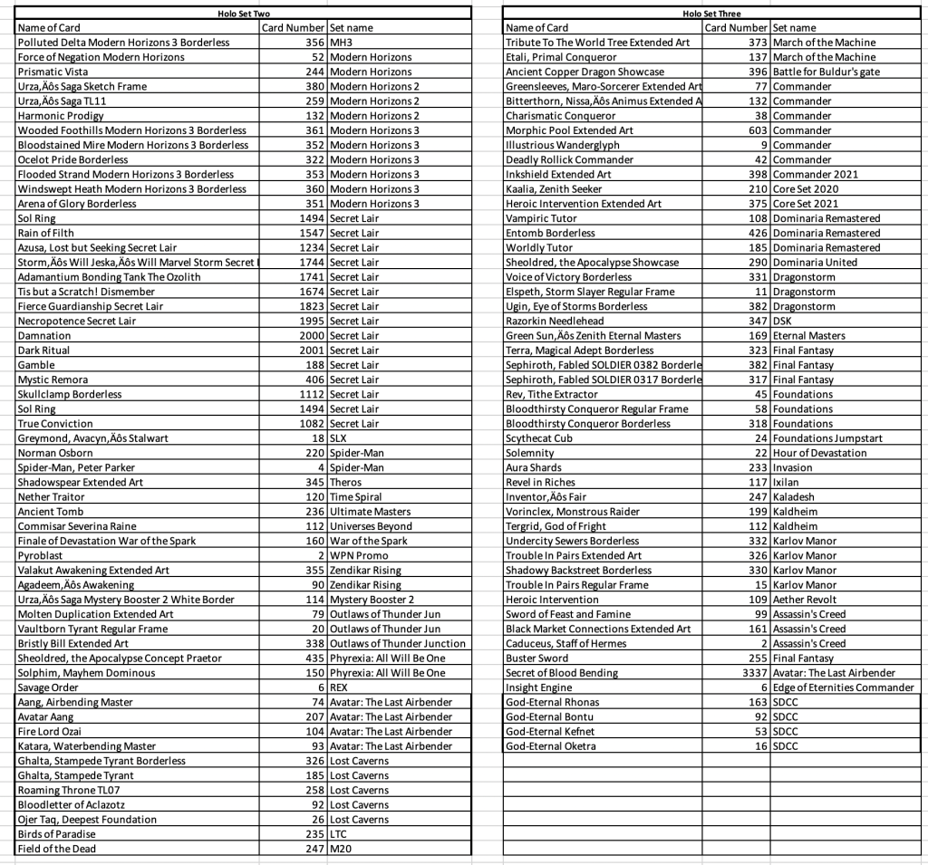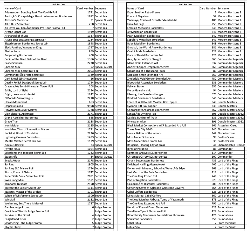 How it works: Email the card name, card number, set and foiling or non-foiling. I will add the suggestions every few days into an excel format and post here. Once we have 56 on any list (Foil, Non-Foil with Holo Stamp, and Non-Holo/Non Foil) we can get it locked in for printing.